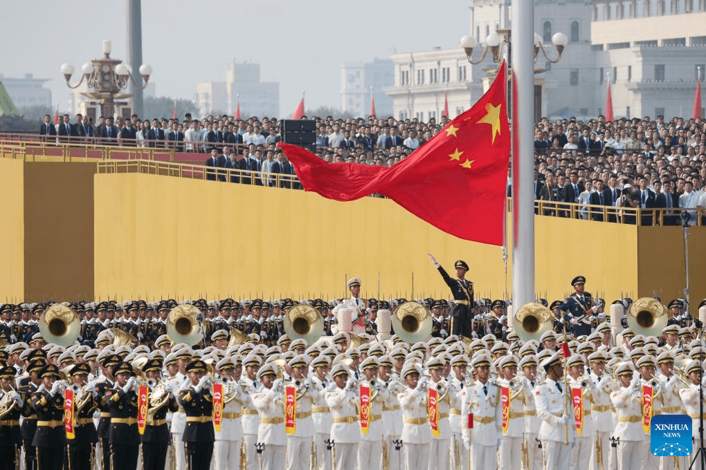 A national flag-raising ceremony is held at Tian'anmen Square during a grand gathering to mark the 80th anniversary of the victory of the Chinese People's War of Resistance against Japanese Aggression and the World Anti-Fascist War, which includes a military parade, in Beijing, capital of China, Sept. 3, 2025. (Xinhua/Yang Lei)