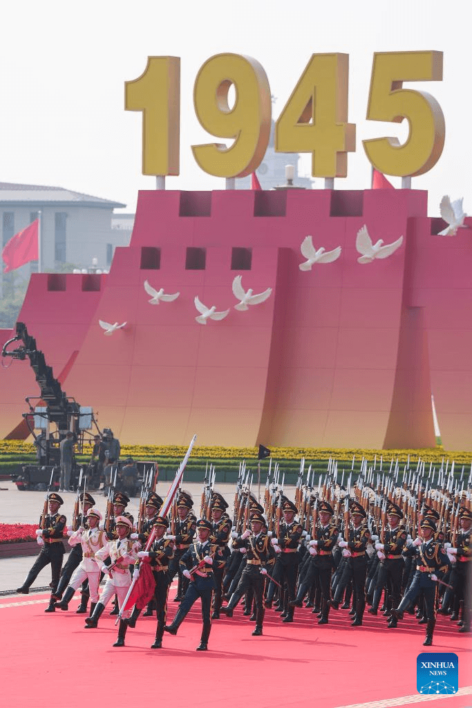 Honor guards escort the Chinese national flag during a grand gathering to mark the 80th anniversary of the victory in the Chinese People's War of Resistance against Japanese Aggression and the World Anti-Fascist War in Beijing, capital of China, Sept. 3, 2025. (Xinhua/Li An)