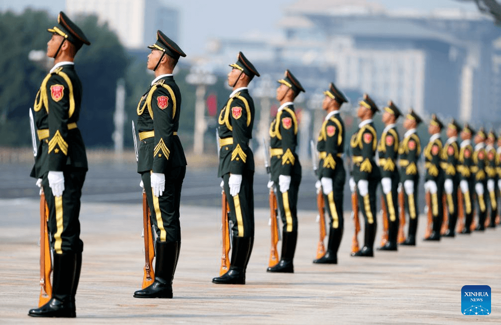 Parade guards stand in place during a grand gathering to mark the 80th anniversary of the victory in the Chinese People's War of Resistance against Japanese Aggression and the World Anti-Fascist War, which includes a military parade, in Beijing, capital of China, Sept. 3, 2025. (Xinhua/Li Ming)